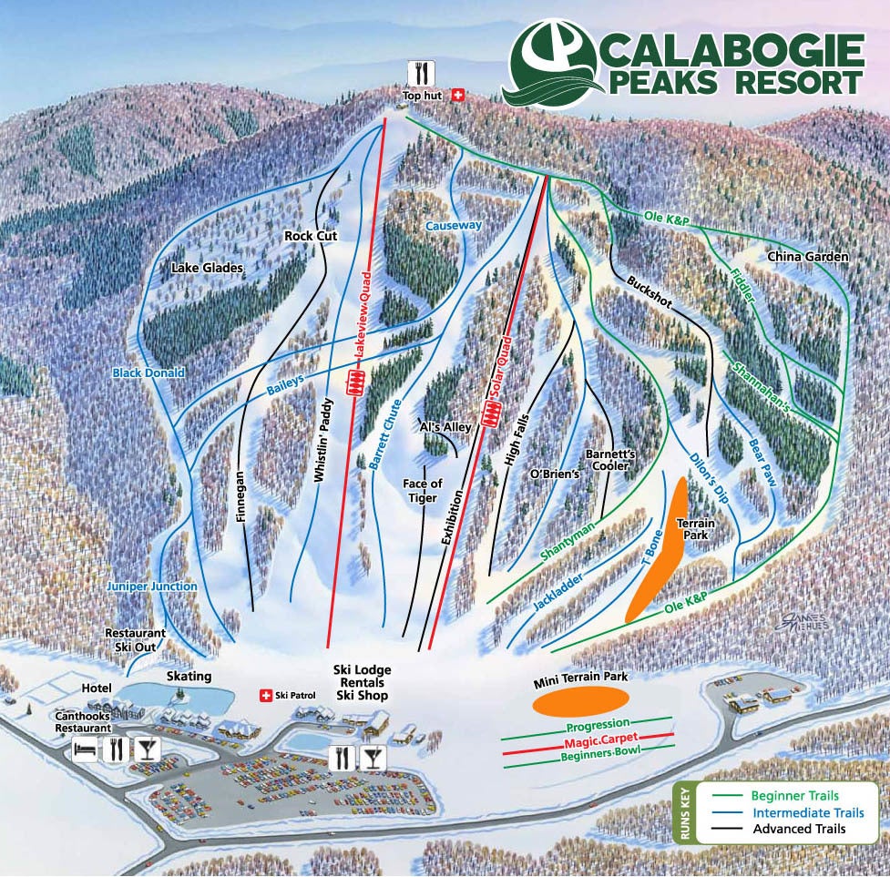 Pistenplan Calabogie PeaksMit der Panoramakarte des Skigebiets Calabogie Peaks entdeckst du alle Lifte, Pisten, Restaurants und Hütten auf einen Blick. Mit einem Klick auf den Pistenplan wird das Bild in der größten Auflösung angezeigt.Zum Vergrößern des Pistenplan hier klicken