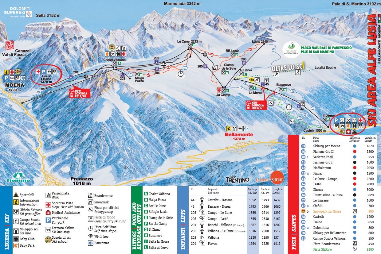 Pistenplan Moena-Alpe Lusia-BellamonteMit der Panoramakarte des Skigebiets Moena-Alpe Lusia-Bellamonte entdeckst du alle Lifte, Pisten, Restaurants und Hütten auf einen Blick. Mit einem Klick auf den Pistenplan wird das Bild in der größten Auflösung angezeigt.Zum Vergrößern des Pistenplan hier klicken